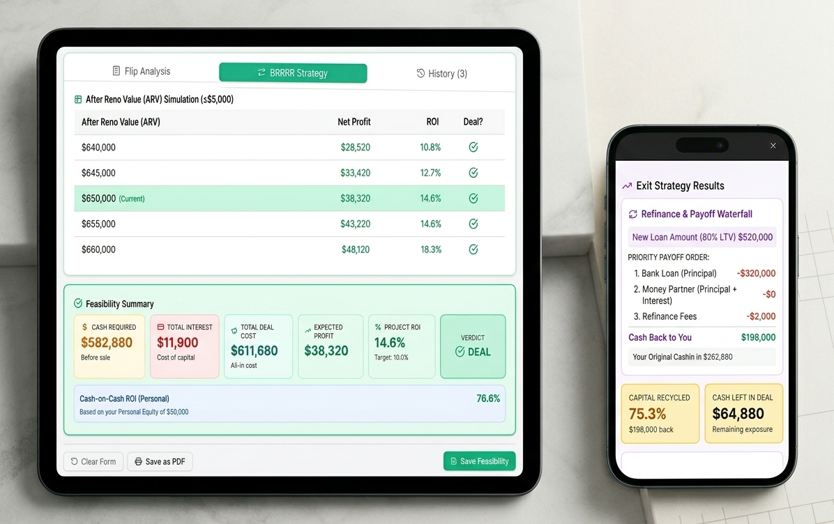Compare a quick capital injection from a House Flip against the long-term wealth of a BRRRR (Buy, Rehab, Rent, Refinance). See your Flip Net Profit and ROI side-by-side with BRRRR Refinance LTV, Debt Service, and Monthly Cash Flow.